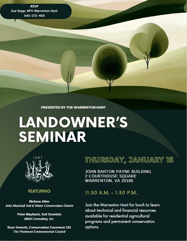 Join the Warrenton Hunt for lunch to learn about technical and financial resources available for residential agricultural programs and permanent conservation options.